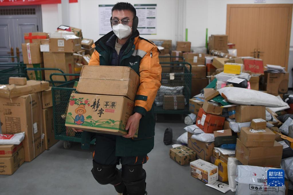 12月23日,在蘭州市城關(guān)區中國郵政速遞物流一個(gè)攬投部,快遞員在搬運快件。