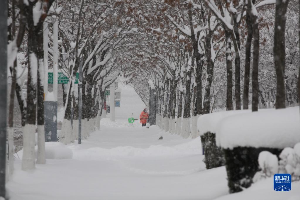 12月23日,在山東省威海市文登區,環(huán)衛工人在街道上清除積雪。
