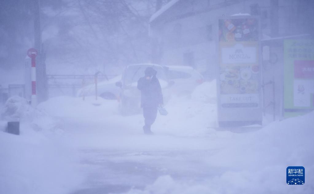 12月23日,行人在日本山形縣山形市藏王溫泉冒雪前行。