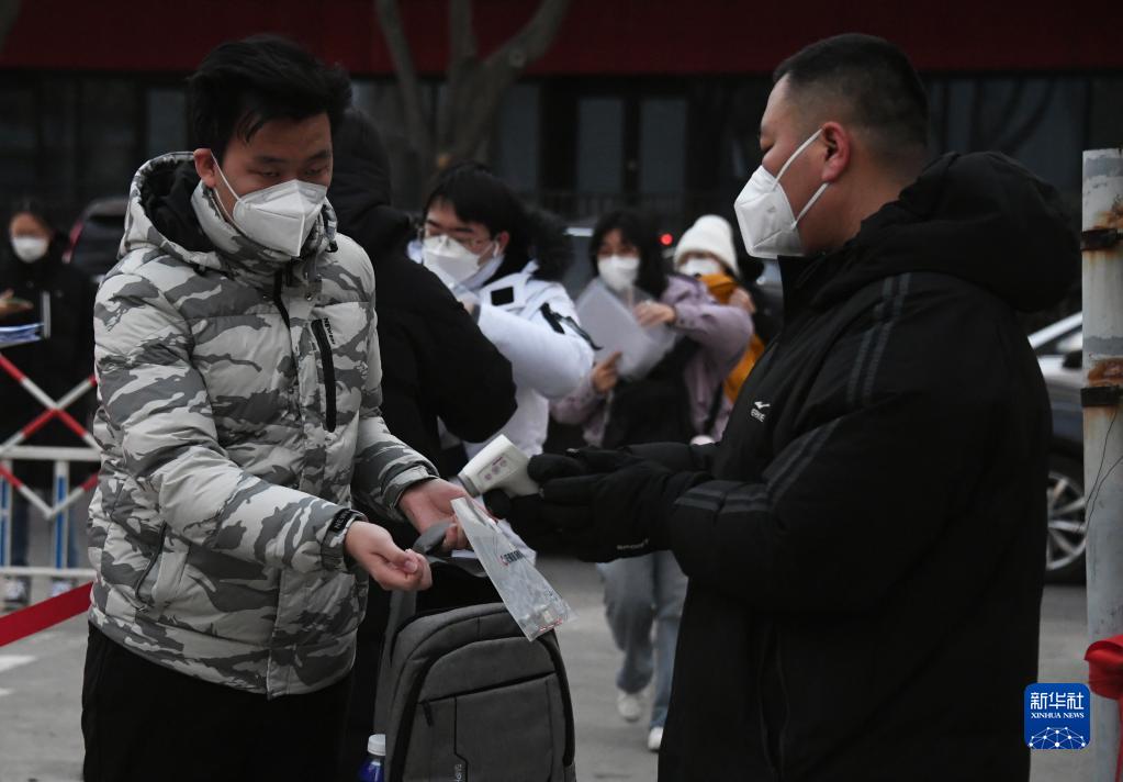 12月24日,在北京外國語(yǔ)大學(xué)考點(diǎn),考生(左)進(jìn)入考場(chǎng)前測量體溫。