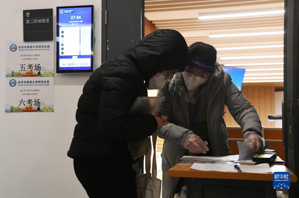12月24日,在北京外國語(yǔ)大學(xué)考點(diǎn),一名考生(左)在進(jìn)入考場(chǎng)前簽到。