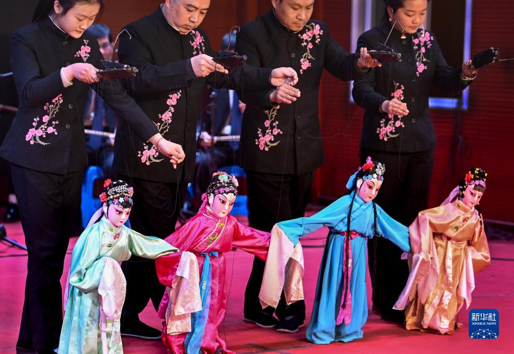 2022年3月4日,陜西省合陽(yáng)縣線(xiàn)腔木偶劇團的演員在合陽(yáng)縣文化館演藝廳內為觀(guān)眾表演提線(xiàn)木偶劇《鬧春》。近年來(lái),陜西省合陽(yáng)縣積極出臺扶持政策,在當地開(kāi)展“非遺進(jìn)校園”、恢復傳統劇目演出、開(kāi)設免費“周末劇場(chǎng)”等方式,讓居民領(lǐng)略傳統非遺的魅力,支持合陽(yáng)提線(xiàn)木偶煥發(fā)生機與活力。