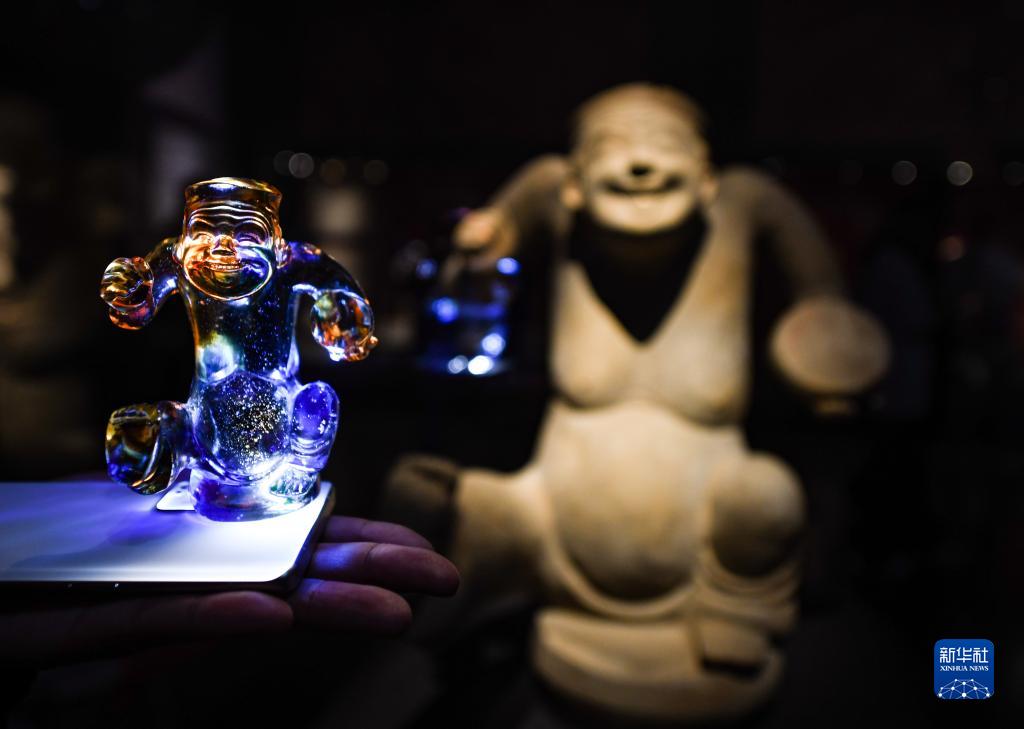 這是2022年5月17日在成都博物館拍攝的漢代陶說(shuō)唱俑和其文創(chuàng )產(chǎn)品(左)。近年來(lái),成都博物館打造文創(chuàng )品牌,培育孵化優(yōu)秀文創(chuàng )產(chǎn)品。文創(chuàng )產(chǎn)品設計師通過(guò)對“鎮館之寶”石犀、漢代陶俑等文物進(jìn)行多元化設計,將文物變成“萌物”,廣受人們的歡迎和追捧。