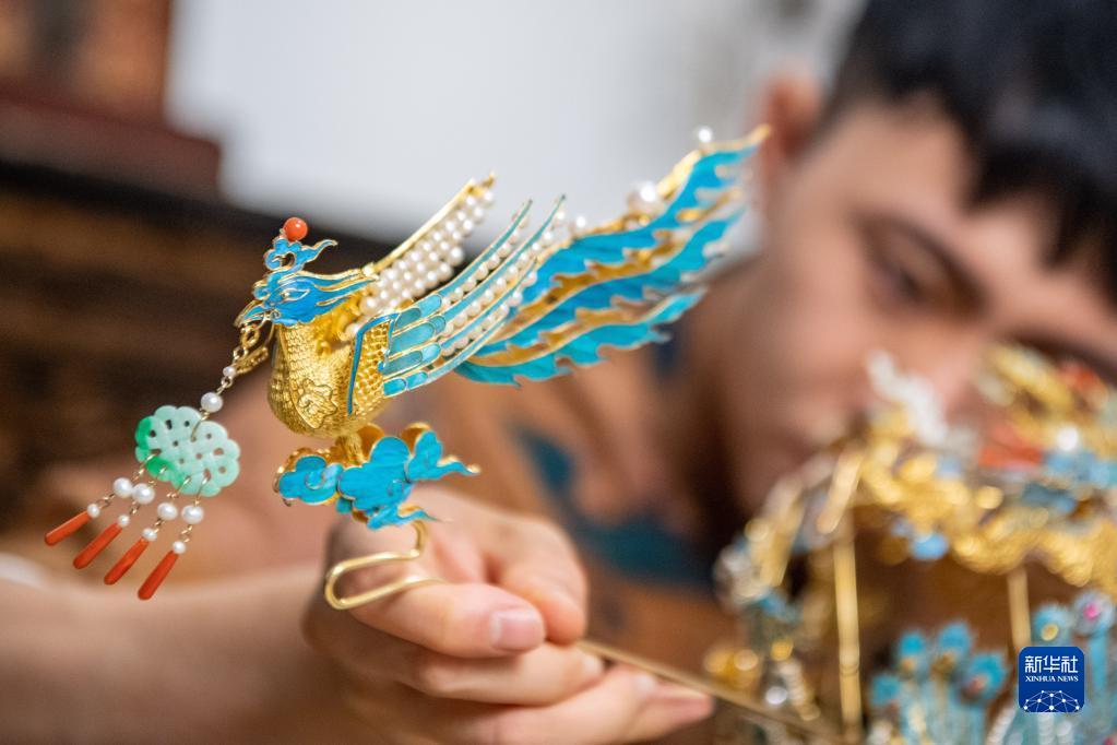 2022年6月9日,“90后”重慶小伙辜國強在組裝花絲鑲嵌作品“鳳引九雛”?;ńz鑲嵌工藝是一門(mén)傳承久遠的中國傳統手工技藝,2008年被列入國家級非物質(zhì)文化遺產(chǎn)名錄。7年前,大學(xué)畢業(yè)不久的辜國強偶然接觸到花絲鑲嵌技藝并迅速愛(ài)上了這門(mén)古老的手藝。拜師學(xué)成后他建立了工作室,探索利用這門(mén)傳統工藝制作適合現代人佩戴的飾品,以創(chuàng )新的手段重塑老技藝,讓傳統工藝煥發(fā)新生機。