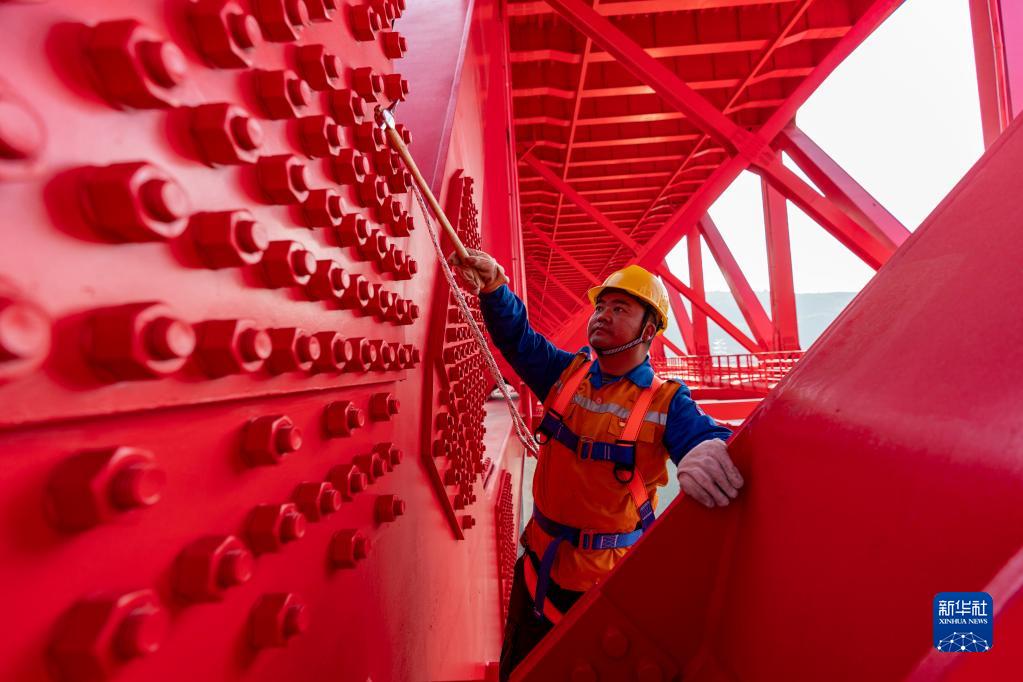 1月18日,昆明鐵路局普洱基礎設施段工務(wù)維修技術(shù)中心的橋隧工施鵬彬在檢查中老鐵路控制性工程元江雙線(xiàn)特大橋螺絲松緊情況。