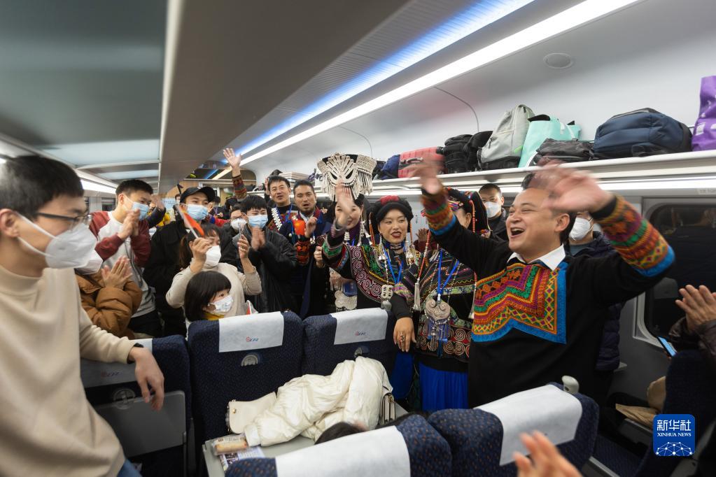 12月26日,彝族群眾身著(zhù)節日的盛裝在新成昆鐵路首發(fā)列車(chē)上為乘客表演節目。