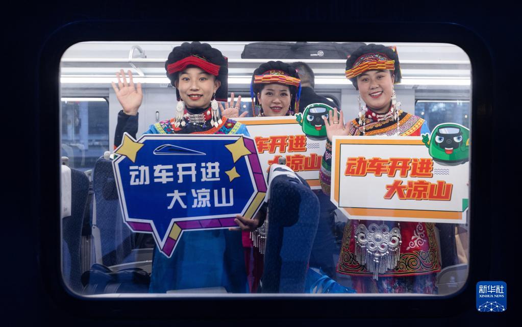 12月26日,彝族群眾身著(zhù)節日的盛裝在新成昆鐵路首發(fā)列車(chē)上招手。