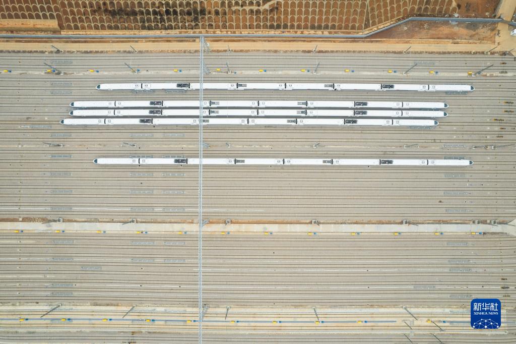 12月26日,列車(chē)準備進(jìn)入渝廈高鐵長(cháng)沙西動(dòng)車(chē)運用所保養、檢修(無(wú)人機照片)。