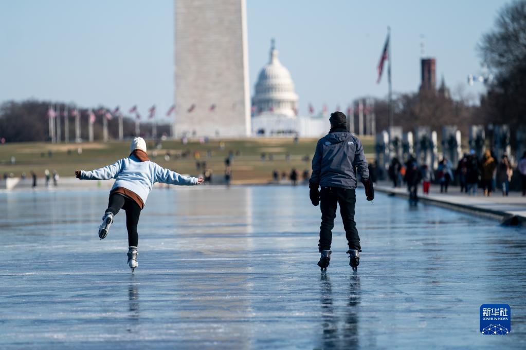 12月25日,在美國首都華盛頓,人們在林肯紀念堂倒影池的冰面上滑冰。