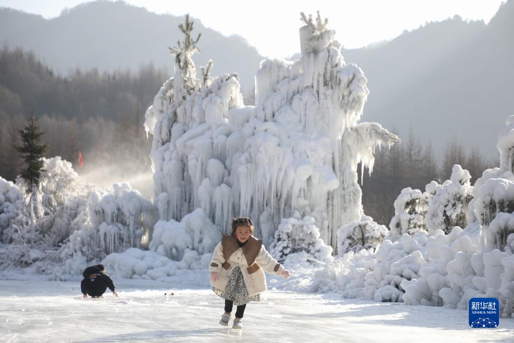 12月26日,在甘肅省渭源縣渭河源景區,小朋友在冰上玩耍。