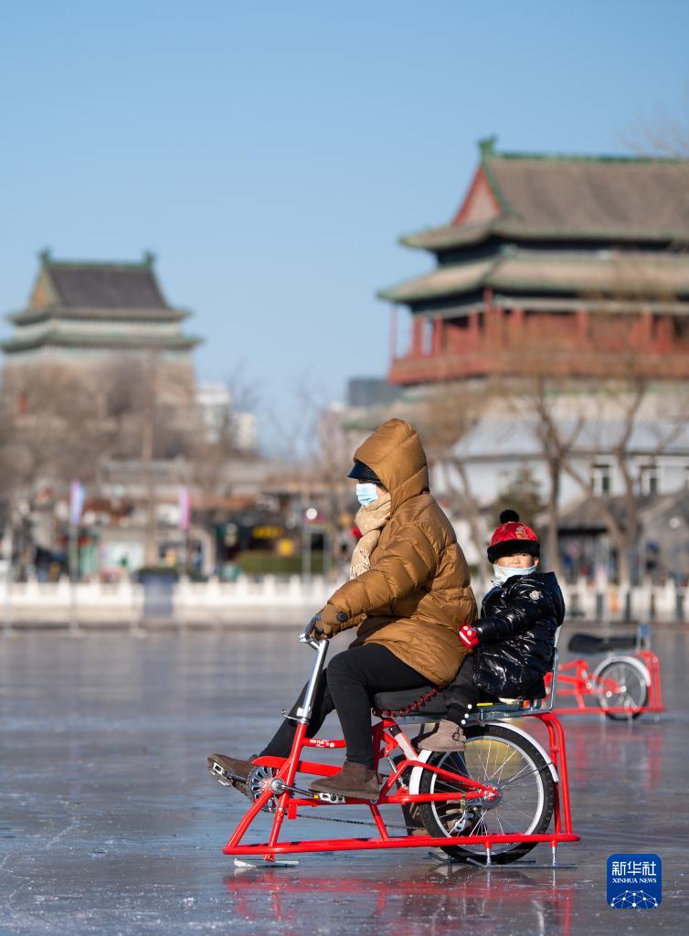 12月27日,家長(cháng)帶著(zhù)小朋友在北京什剎海冰場(chǎng)上騎冰上自行車(chē)。