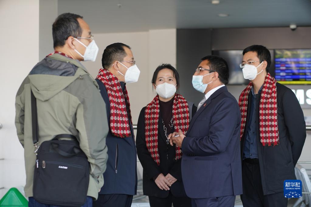 12月27日,尼泊爾鐵路局發(fā)言人阿曼·奇特洛卡(右二)在尼泊爾加德滿(mǎn)都機場(chǎng)迎接中國專(zhuān)家組。