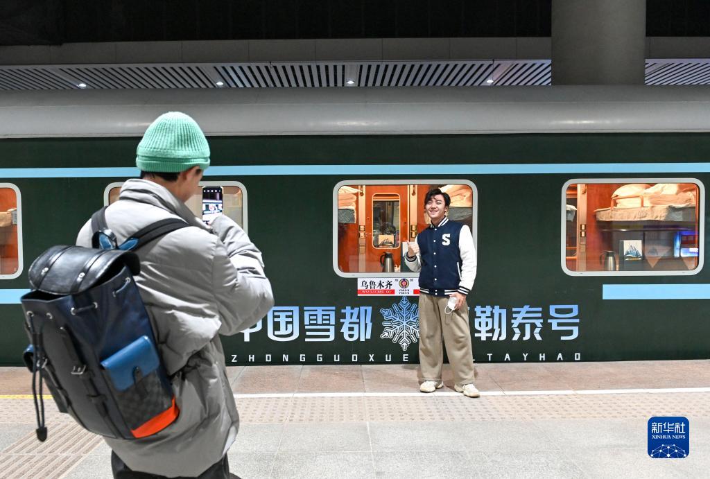 12月28日,在烏魯木齊站,旅客在Y965次“中國雪都·阿勒泰號”冰雪游旅客列車(chē)旁拍照留念。