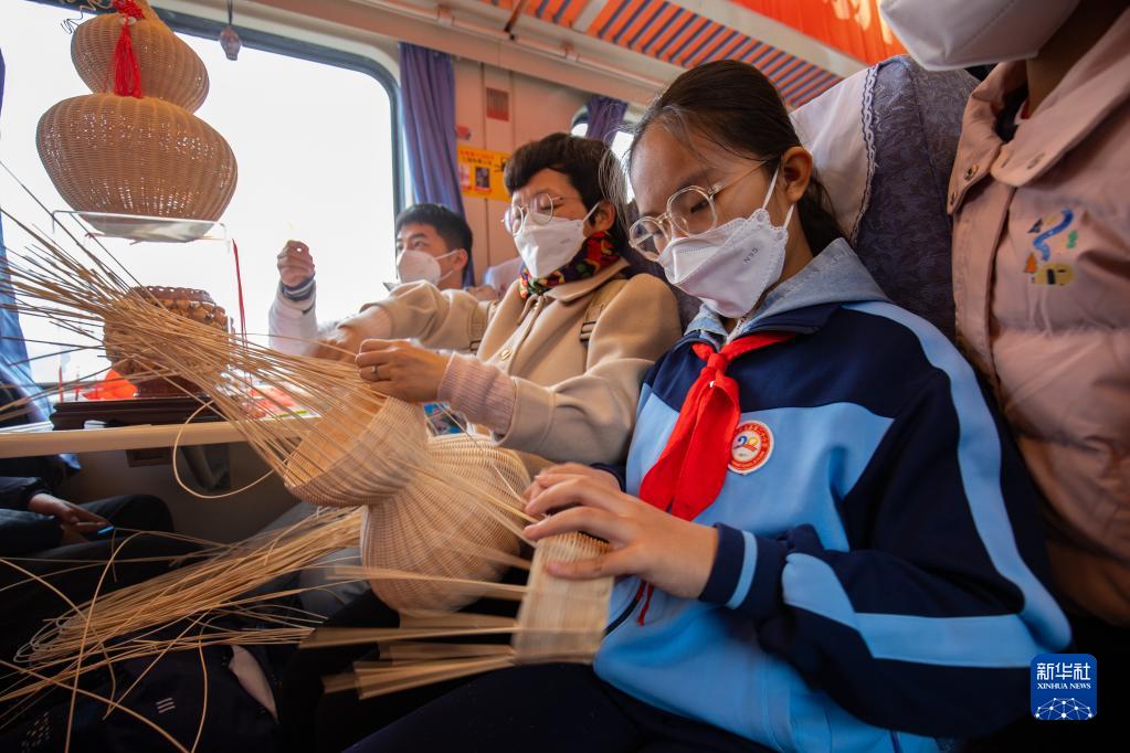 12月30日,在T8010次列車(chē)上,福建省泉州市安溪縣竹編大師陳紅萍(左二)帶旅客體驗竹編技藝。