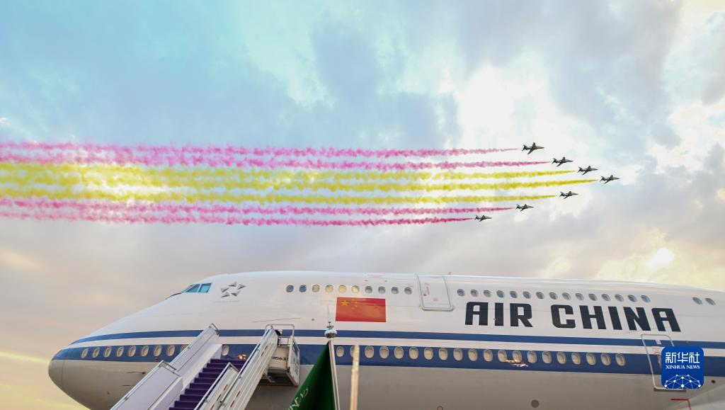 這是2022年12月7日,國家主席習近平抵達沙特阿拉伯首都利雅得,出席首屆中國-阿拉伯國家峰會(huì )、中國-海灣阿拉伯國家合作委員會(huì )峰會(huì )并對沙特進(jìn)行國事訪(fǎng)問(wèn)時(shí),禮賓護衛機在空中拉出象征中國國旗的紅黃兩色彩帶。新華社記者 謝環(huán)馳 攝
