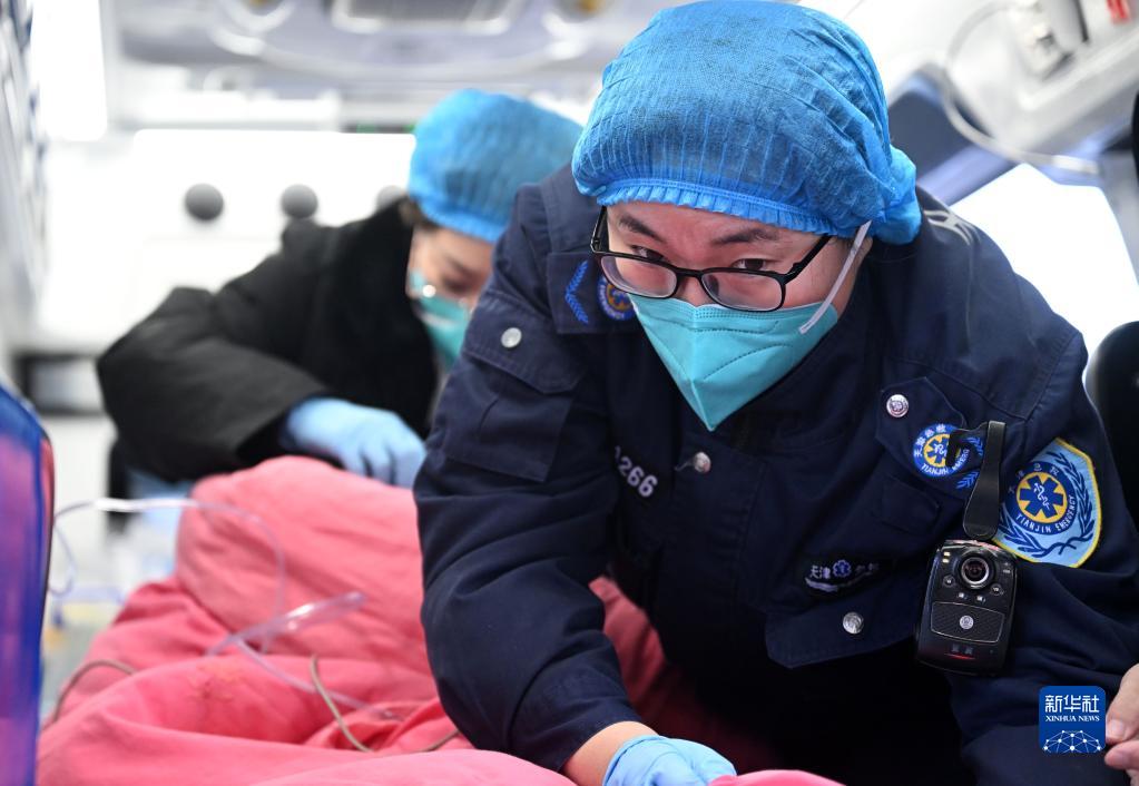 在天津市急救中心一輛急救車(chē)上,急救醫生謝艷杰對病人做緊急處理(12月29日攝)。新華社記者 趙子碩 攝
