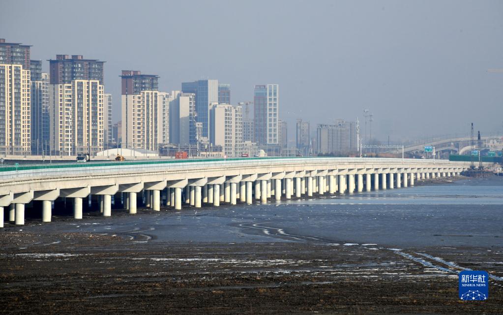 這是12月30日拍攝的建成通車(chē)的青蘭高速公路改擴建工程女姑口跨海特大橋。
