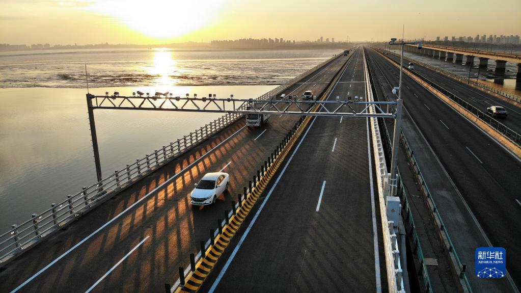 這是12月30日拍攝的建成通車(chē)的青蘭高速公路改擴建工程女姑口跨海特大橋(無(wú)人機照片)。新華社記者 李紫恒 攝
