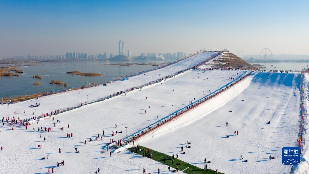 12月31日,市民在寧夏銀川市閱?;﹫?chǎng)體驗冰雪項目(無(wú)人機照片)。