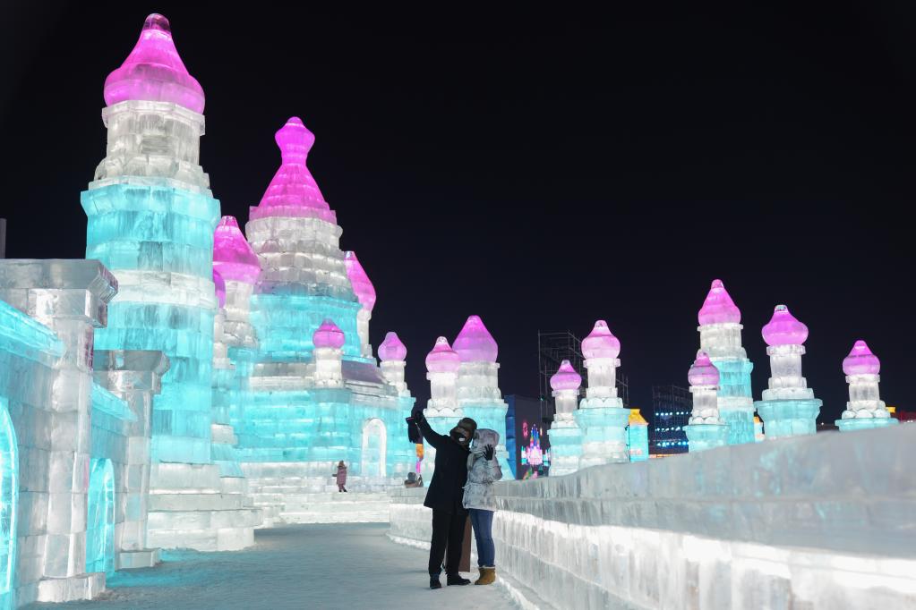 當日,許多市民和游客來(lái)到哈爾濱冰雪大世界園區游玩,迎接新年到來(lái)。