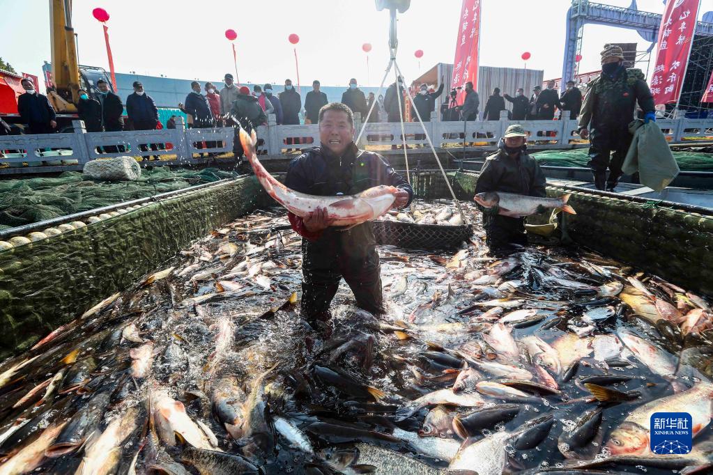 新年臨近,江蘇省泰州市姜堰區溱湖6000多畝水域進(jìn)入冬季捕魚(yú)季,漁民們抓緊捕撈供應節日市場(chǎng)。