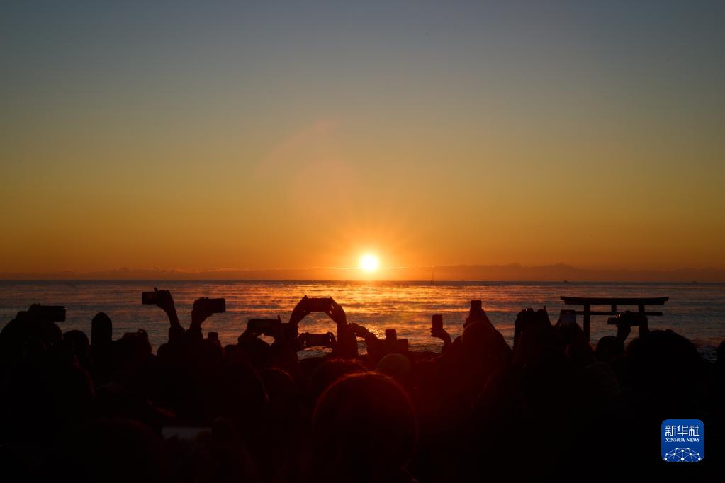 1月1日,人們在日本茨城縣大洗町的海邊拍攝日出。