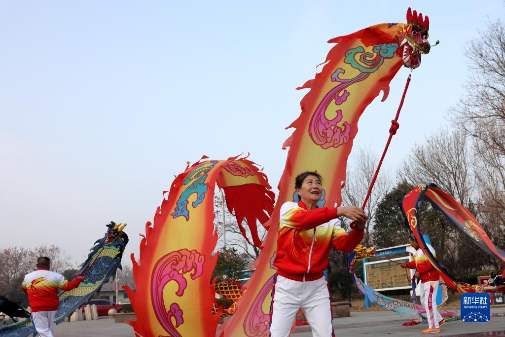 1月1日,在山東省棗莊市光明路街道西沙河公園,“彩帶龍”愛(ài)好者舞“彩龍”迎新年。