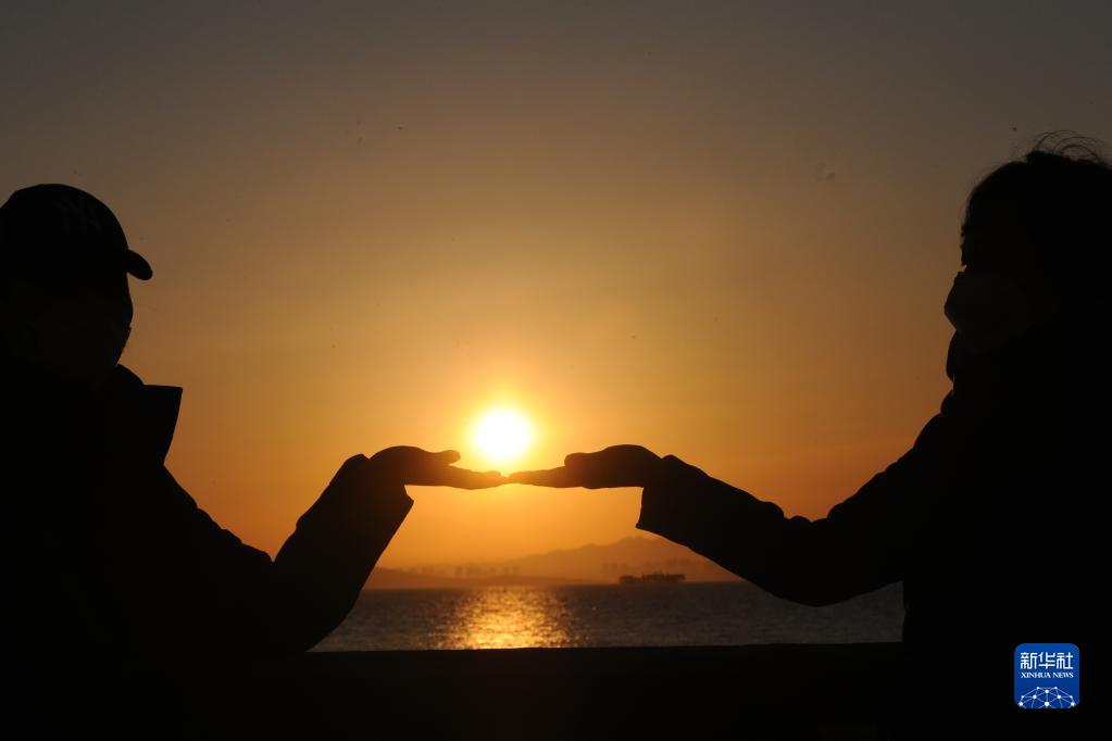 1月1日,人們在山東省煙臺市漁人碼頭棧橋迎接新年日出。