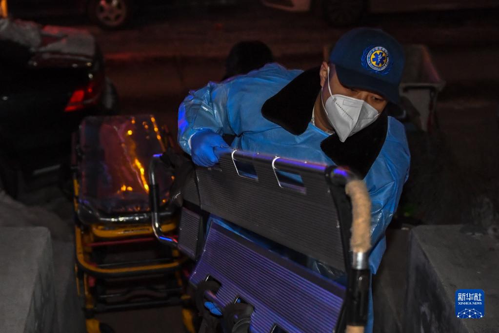 2022年12月31日,救護車(chē)抵達患者家樓下后,長(cháng)春市急救中心富民大街急救站擔架員徐文超抬擔架上樓。