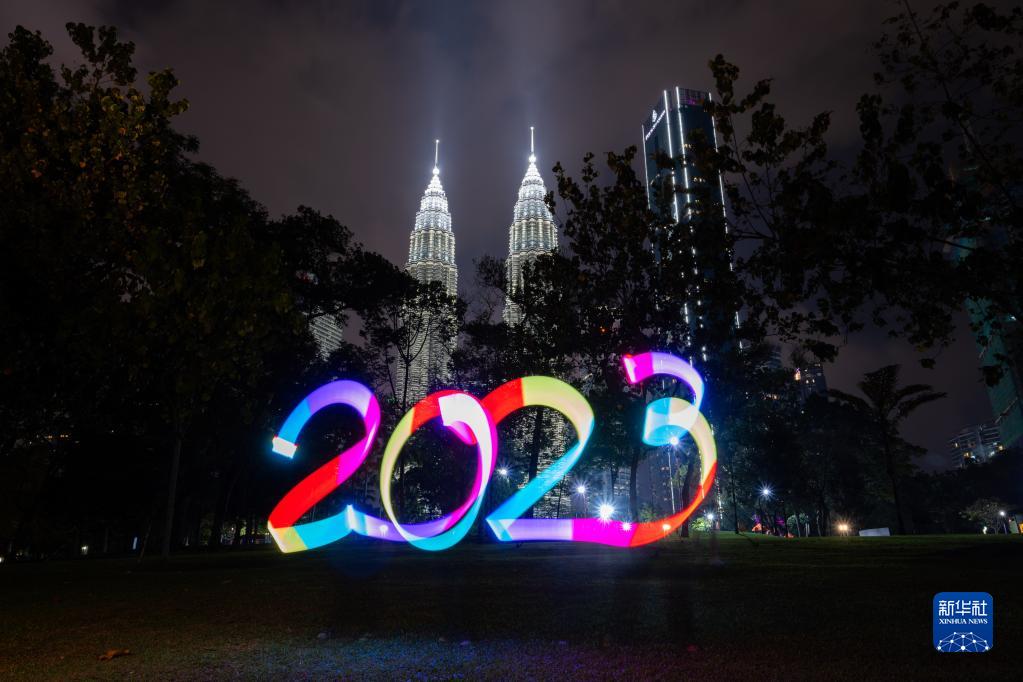 這是2022年12月31日晚在馬來(lái)西亞吉隆坡拍攝的2023字樣的光繪圖案。