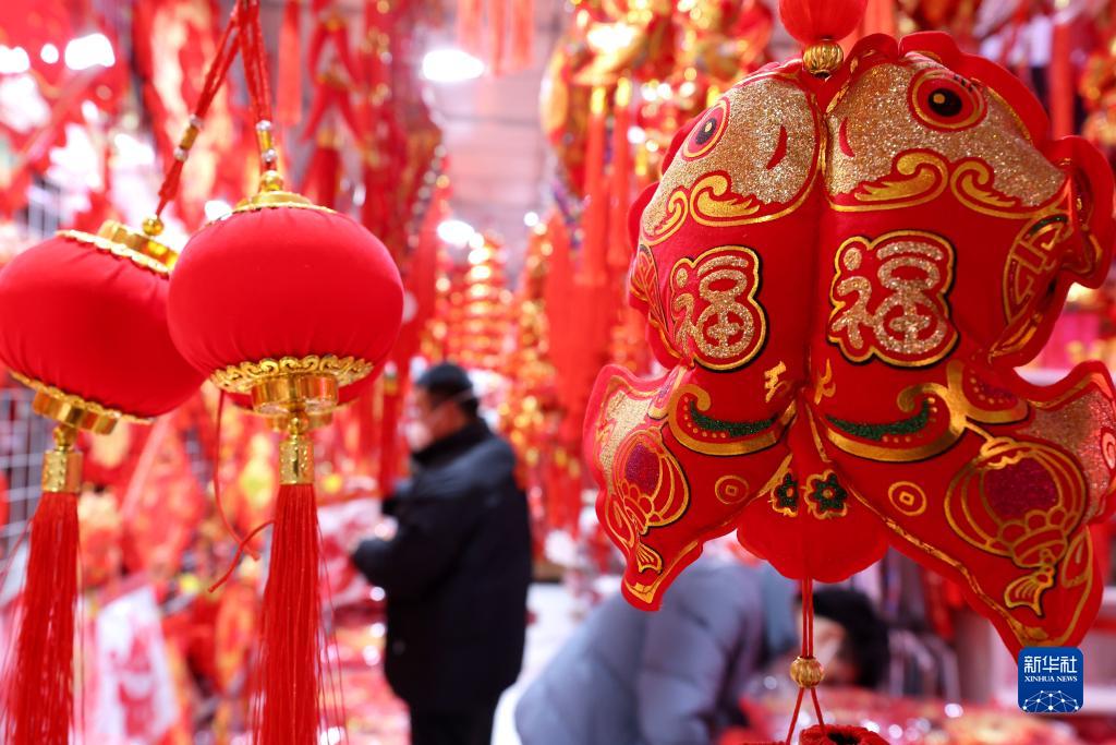 1月1日,人們在山東省棗莊市一處年貨市場(chǎng)選購新年飾品。
