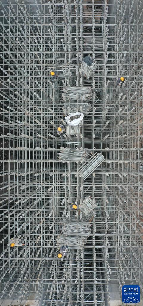 1月1日,浙江省臺州市杭溫鐵路仙居高架站項目現場(chǎng),工人在加緊施工(無(wú)人機照片)。