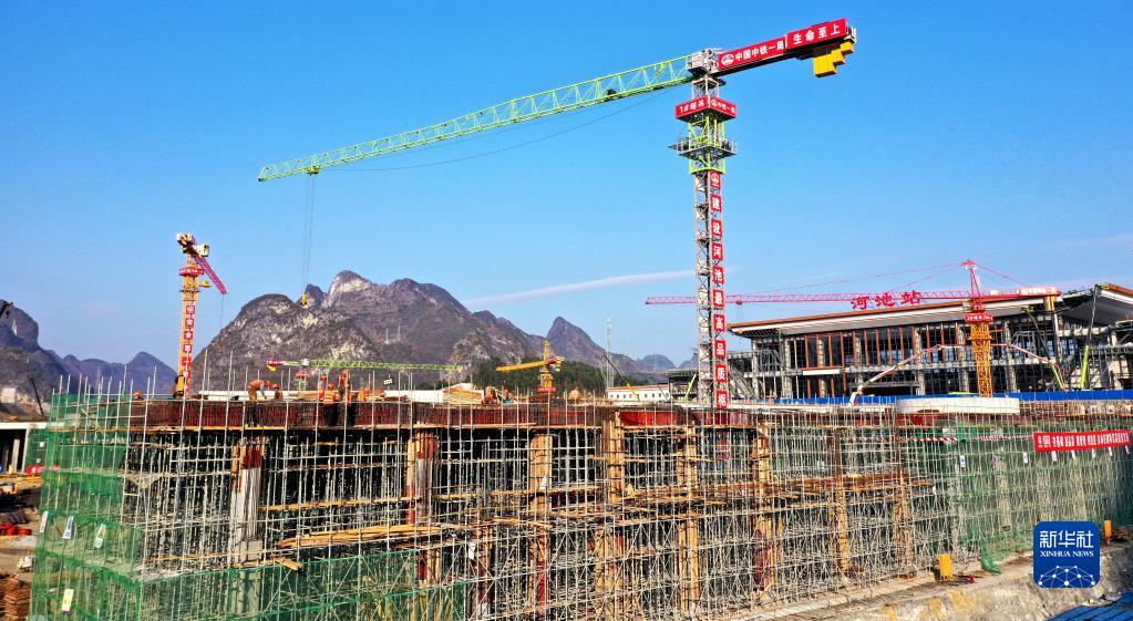1月1日拍攝的建設中的貴南高鐵廣西河池站前廣場(chǎng)建設工地。