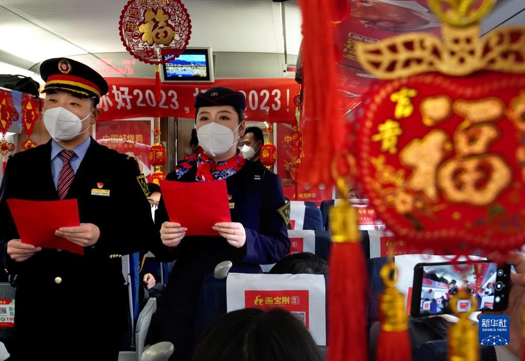 在2023年元旦到來(lái)之際,列車(chē)工作人員將車(chē)廂布置一新,舉行了“你好2023,相約2023”賀新年活動(dòng),為旅客獻上歡快的演出,送上新年的祝福。