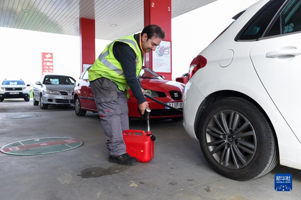 2022年12月31日,在西班牙馬德里,加油站工作人員為一輛汽車(chē)加油。