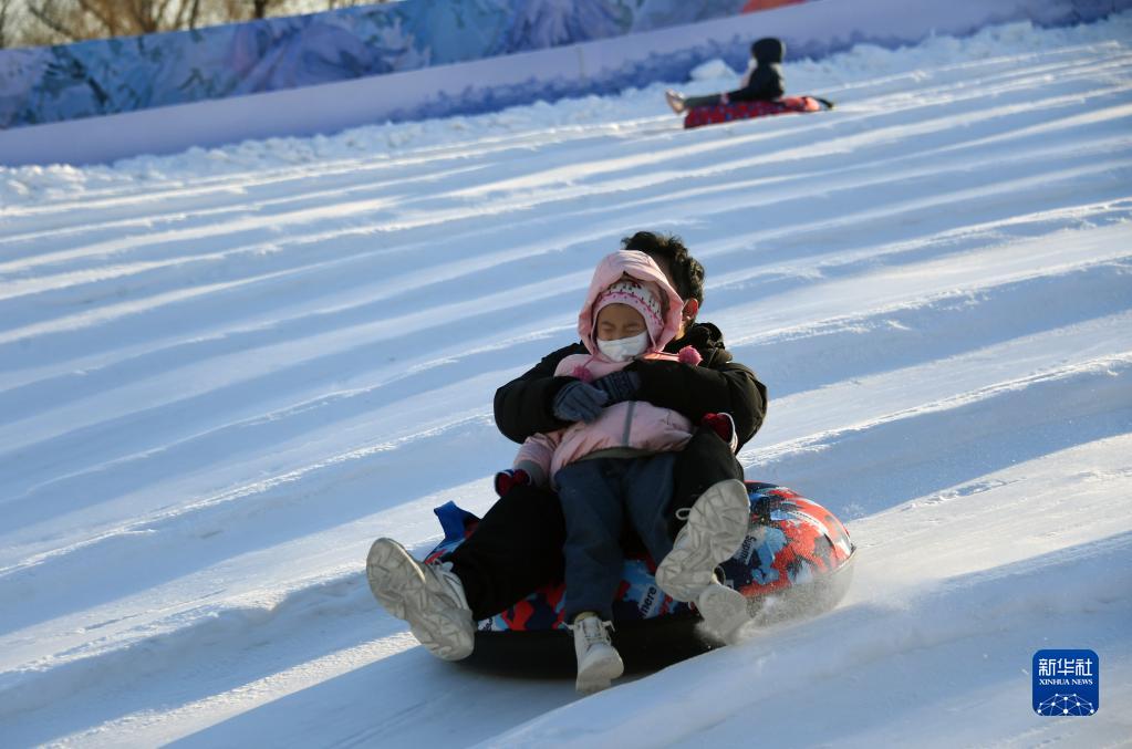 1月2日,一名小朋友和家長(cháng)在北京玉淵潭公園體驗“雪上飛碟”。