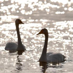 1月2日,大天鵝在三河口天鵝灘濕地的水面上游弋。
