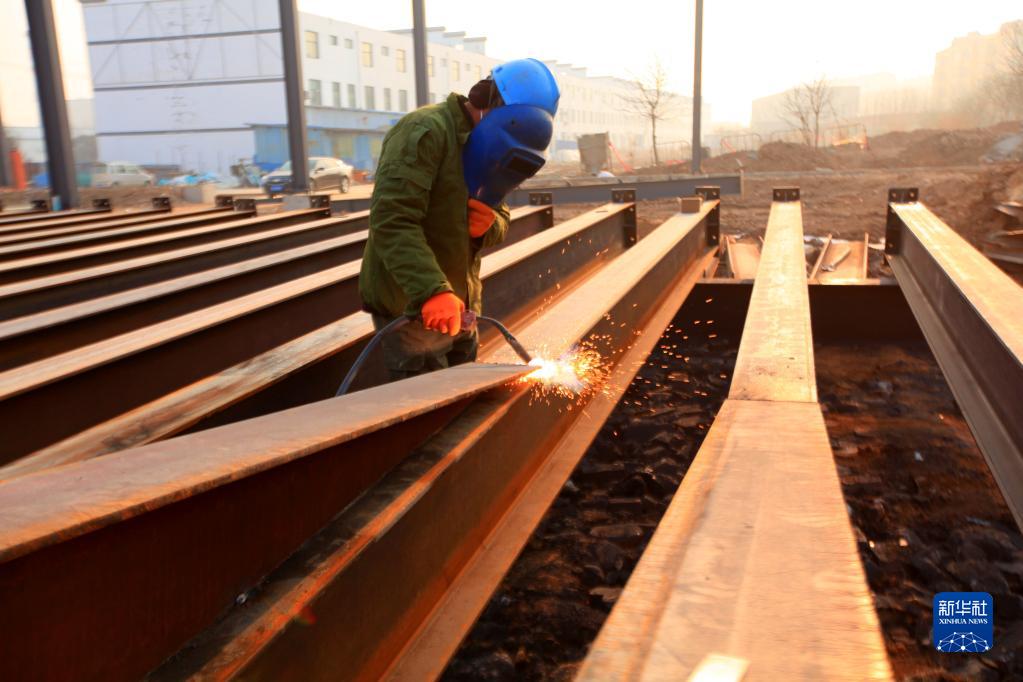 1月3日,工人在山東省臨沂市平邑縣一處建筑工地焊接鋼材。