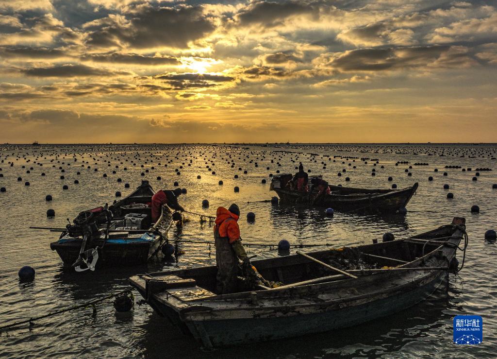 當日,在山東省榮成市尋山街道愛(ài)倫灣海洋牧場(chǎng),漁民駕駛漁船在海上忙碌著(zhù),呈現一幅“海上冬耕”的畫(huà)面。