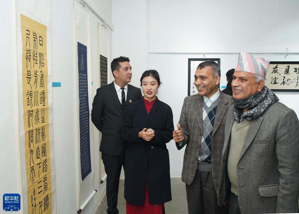 1月3日,在尼泊爾首都加德滿(mǎn)都,特里布文大學(xué)孔子學(xué)院尼方院長(cháng)巴爾穆昆達·雷格米(右二)在“中尼這十年”書(shū)畫(huà)攝影藝術(shù)成就展上欣賞書(shū)法作品。
