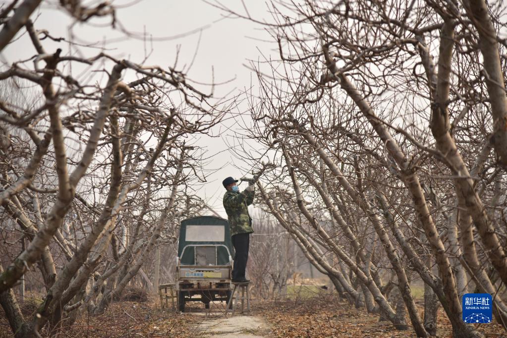 1月4日,在山東省聊城市茌平區賈寨鎮前付村,農民在田間為桃樹(shù)剪枝。