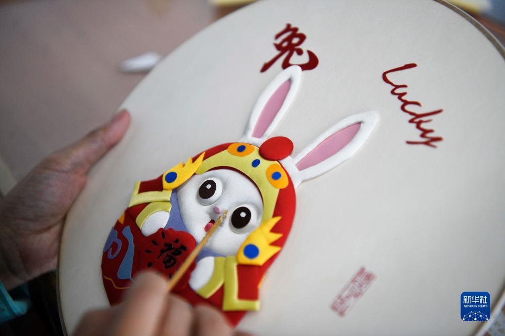 1月4日,在豐寧縣非遺布糊畫(huà)就業(yè)工坊,手工藝人在制作兔年主題布糊畫(huà)。