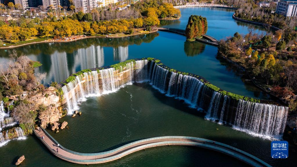 1月4日拍攝的昆明市瀑布公園一景(無(wú)人機照片)。