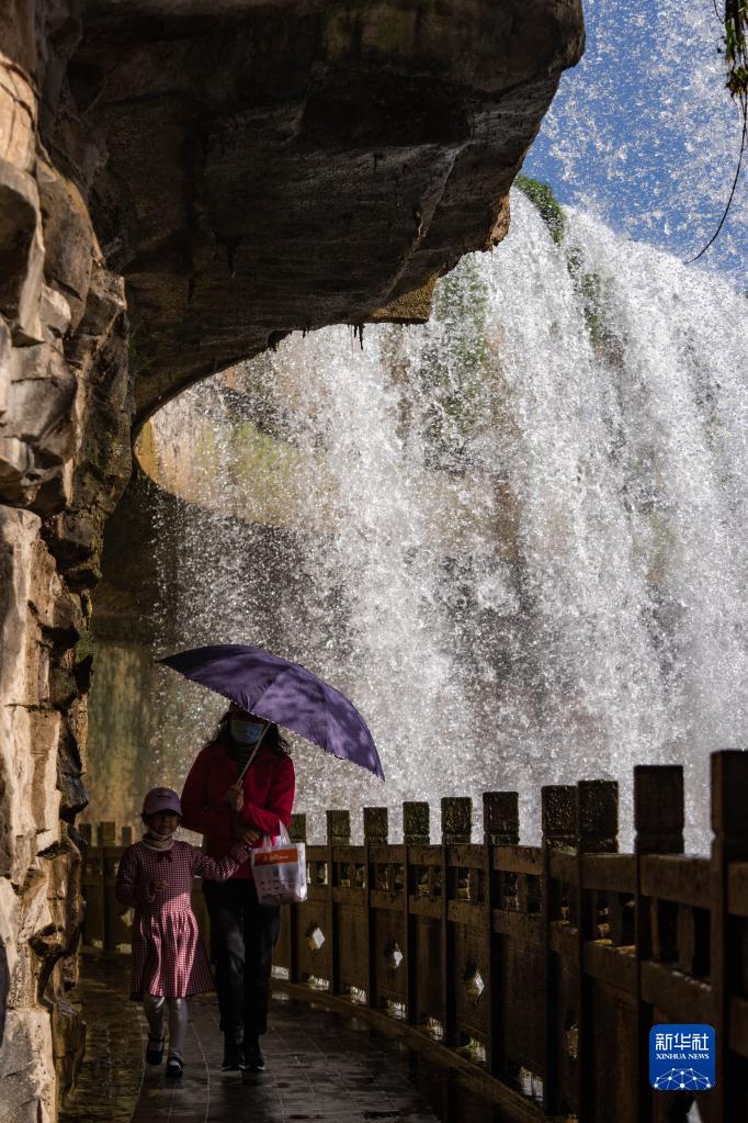 當日,云南昆明天氣晴好,游客來(lái)到位于昆明北部山水新區的昆明瀑布公園參觀(guān)游覽。公園內的人工瀑布落差約12.5米,寬幅約400米。