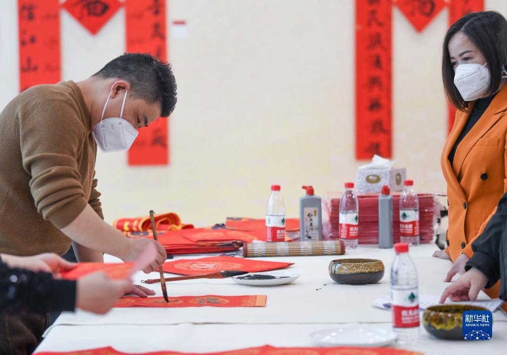 1月4日,在新疆圖書(shū)館主會(huì )場(chǎng)內,書(shū)法家(左)為市民寫(xiě)春聯(lián)。