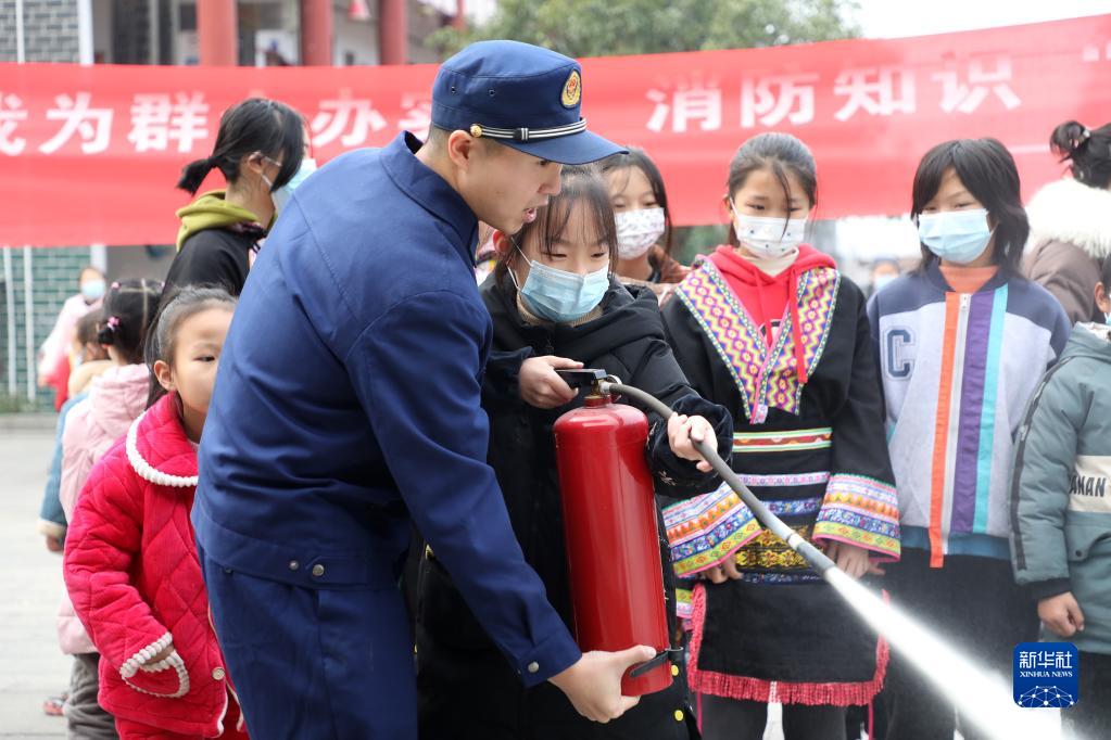 1月4日,在資興市唐洞街道茶坪瑤族村,小朋友在消防員的指導下學(xué)習滅火技能。