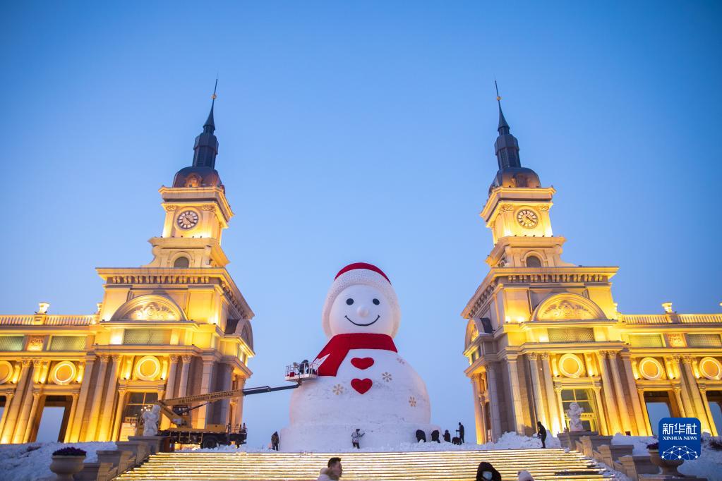 1月4日,經(jīng)過(guò)工人十余天的忙碌,憑借“超治愈”的笑容,成為哈爾濱“網(wǎng)紅”的大雪人,“回歸”松花江畔。今年的大雪人用雪量約2000立方米,依舊18米高,憨態(tài)可掬。