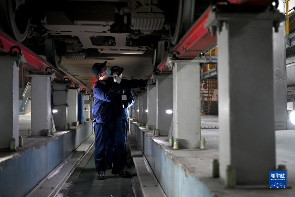 1月4日,合肥南動(dòng)車(chē)運用所的工作人員對動(dòng)車(chē)組列車(chē)進(jìn)行檢修。
