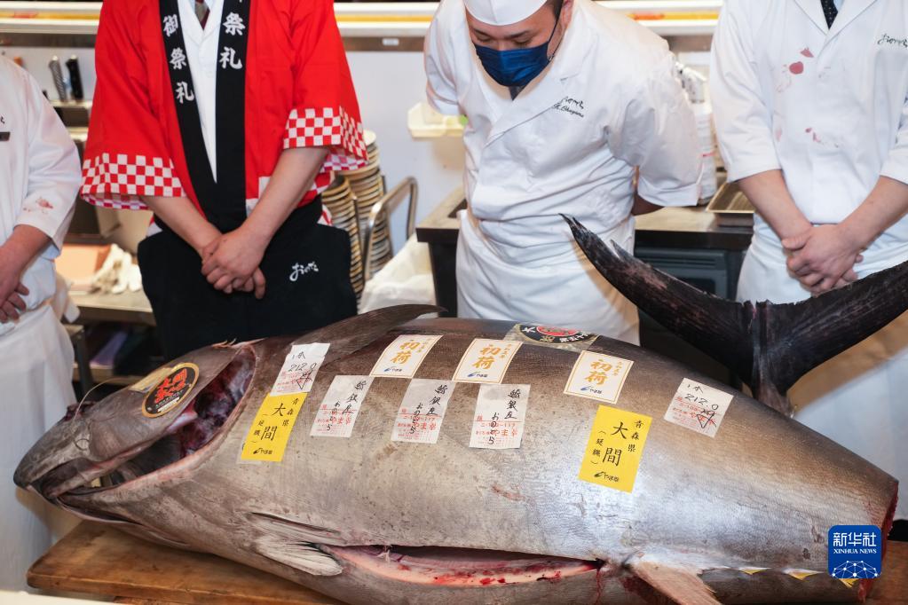 1月5日,一名廚師在日本東京表參道一家餐館查看最高價(jià)金槍魚(yú)。