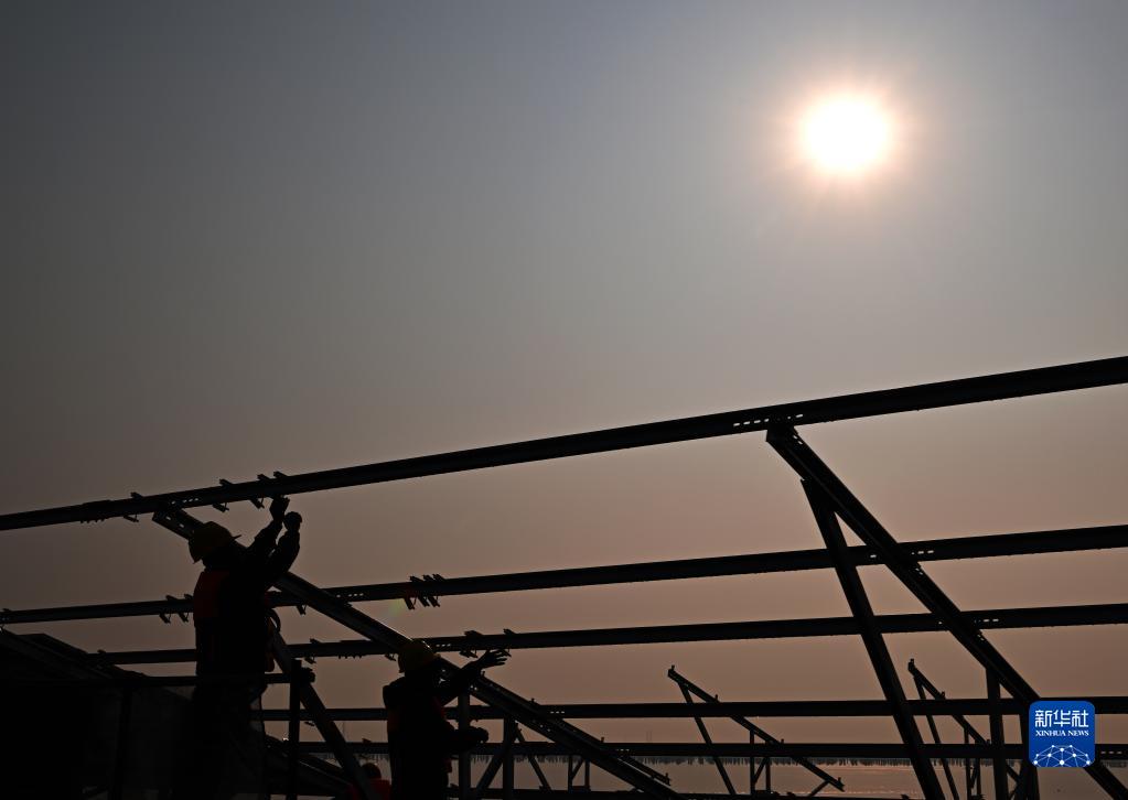 1月5日,建設者在華電海晶光伏項目B標段施工。